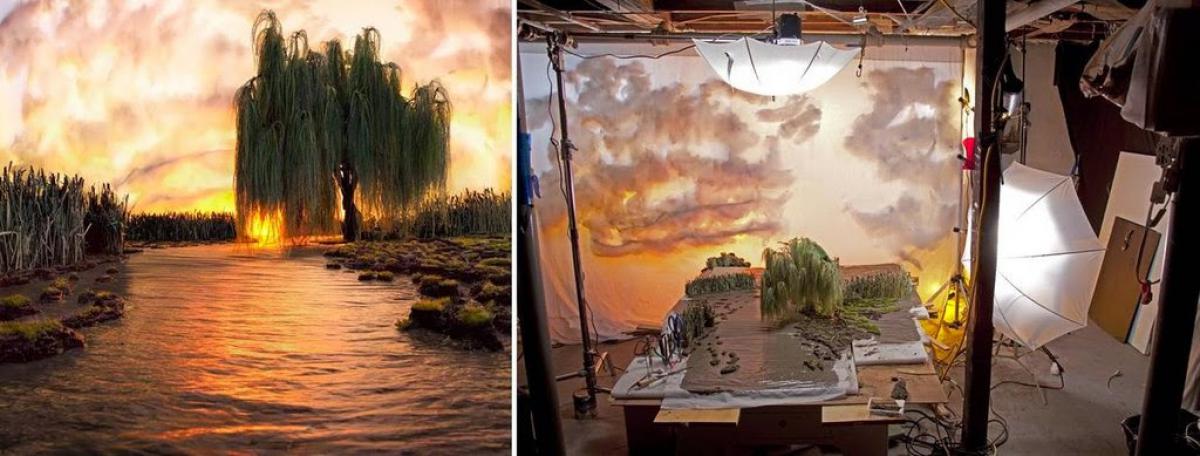 Here are some of his finest masterpieces to enjoy. On the left side you can see the final product and on the right there is an image of how was the whole thing staged using special effects.